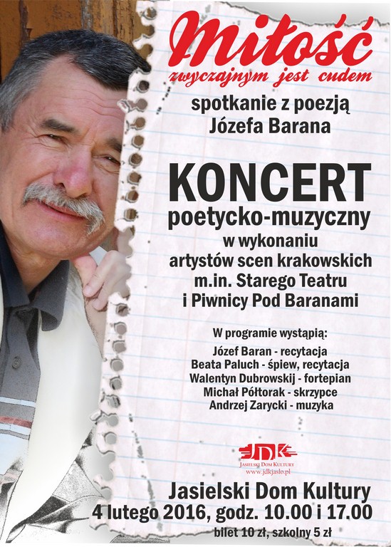 Na scenie JDK wystąpią: Józef Baran (recytacja), Beata Paluch (recytacja, śpiew), Walentyn Dubrowskij (fortepian), Michał Półtorak (skrzypce) oraz Andrzej Zarycki (muzyka). Koncert odbędzie o godz. 12.00 oraz 17.00. Bilety w cenie 10 zł (dorośli) i 5 zł (bilet szkolny) są do nabycia w sekretariacie JDK.