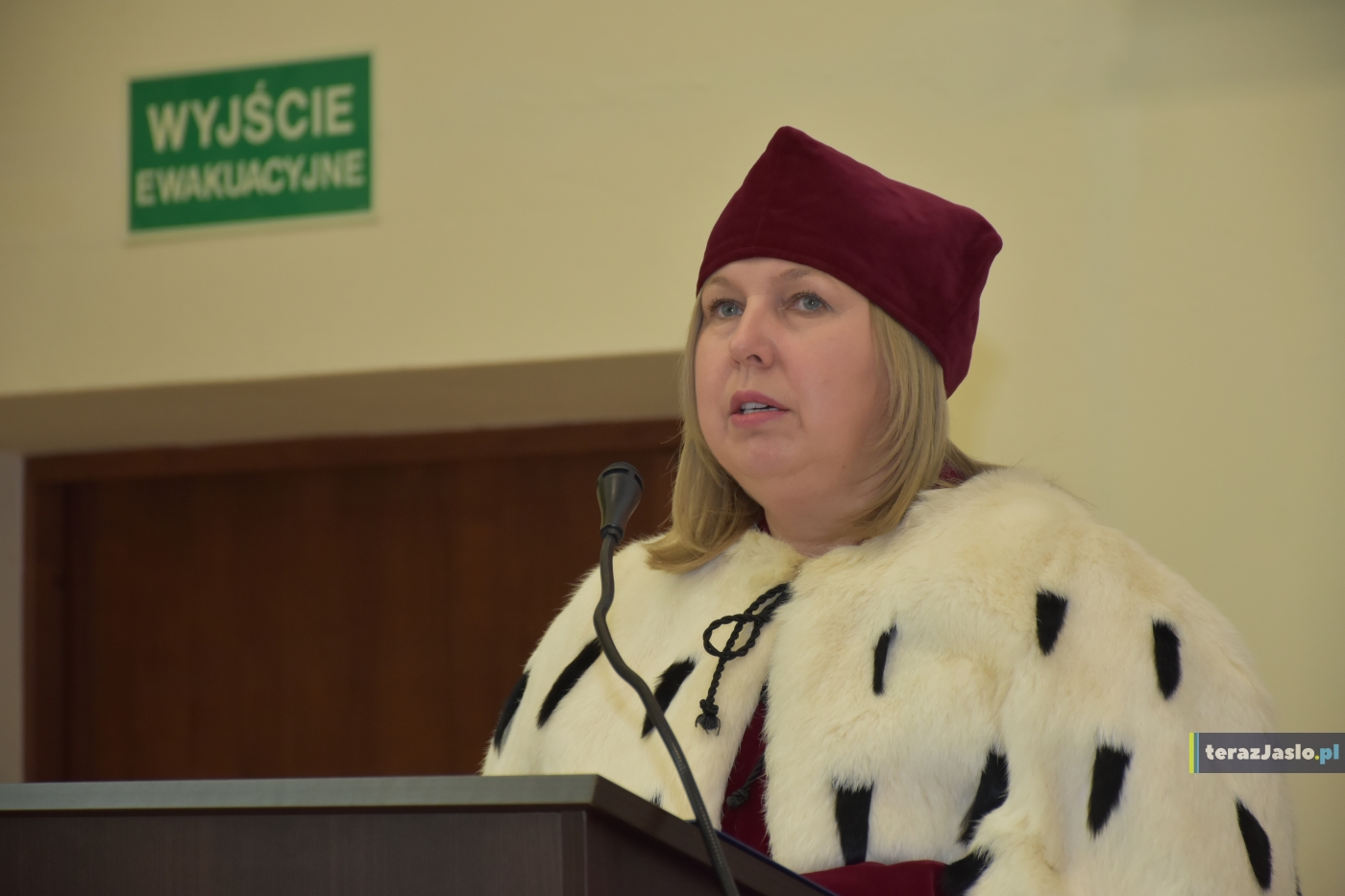 Następnie powitała studentów I roku, którzy w dniu dzisiejszym oficjalnie zasilili wspólnotę Podkarpackiej Szkoły Wyższej w Jaśle. – Niech studia w Podkarpackiej Szkole Wyższej będą dla Was czasem odkrywania, rozwijania pasji i budowania przyjaźni. Nie bójcie się pytać, próbować, a czasem nawet się pomylić, bo właśnie tak rodzi się prawdziwa wiedza. Niech studia będą dla Was nie tylko czasem nauki, ale też spotkań, inspiracji i doświadczeń, które zostaną z Wami na całe życie. Za chwilę przed Wami jeden z najważniejszych momentów dzisiejszej uroczystości – akt ślubowania i immatrykulacji. To symboliczne wydarzenie, w którym młodzi ludzie stają się pełnoprawnymi członkami naszej akademickiej wspólnoty. Ślubując przyrzekacie nie tylko rzetelnie zdobywać wiedzę, ale także kierować się zasadami uczciwości, szacunku i odpowiedzialności. – powiedziała.